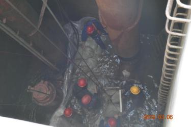 水廠機(jī)修人員下到12米沉水井內(nèi)的漏水點(diǎn),詳細(xì)檢查后發(fā)現(xiàn)2號取水泵底座共6個固定螺絲,2個已斷裂,3個已松動,導(dǎo)致2號取水泵運(yùn)行時底座不穩(wěn),嚴(yán)重影響供水安全,機(jī)修人員立即向公司領(lǐng)導(dǎo)匯報,制定了維修方案。