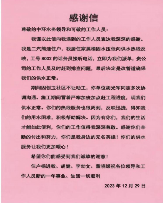 此次管道改造工作,樊城管網(wǎng)公司壓實主體責任,服務前置,科學組織,有效協(xié)調,贏得了廣大用戶的稱贊。一面錦旗、一封感謝信,不僅承載著用戶對我們當前工作的肯定,也寄予了對我們日后工作的期許。襄陽中環(huán)水務有限公司將繼續(xù)致力于為廣大市民用戶提供優(yōu)質安全的供水服務,確保用戶反映的各項用水問題能夠得到及時妥善處理,實現(xiàn)供水事業(yè)的高質量發(fā)展。